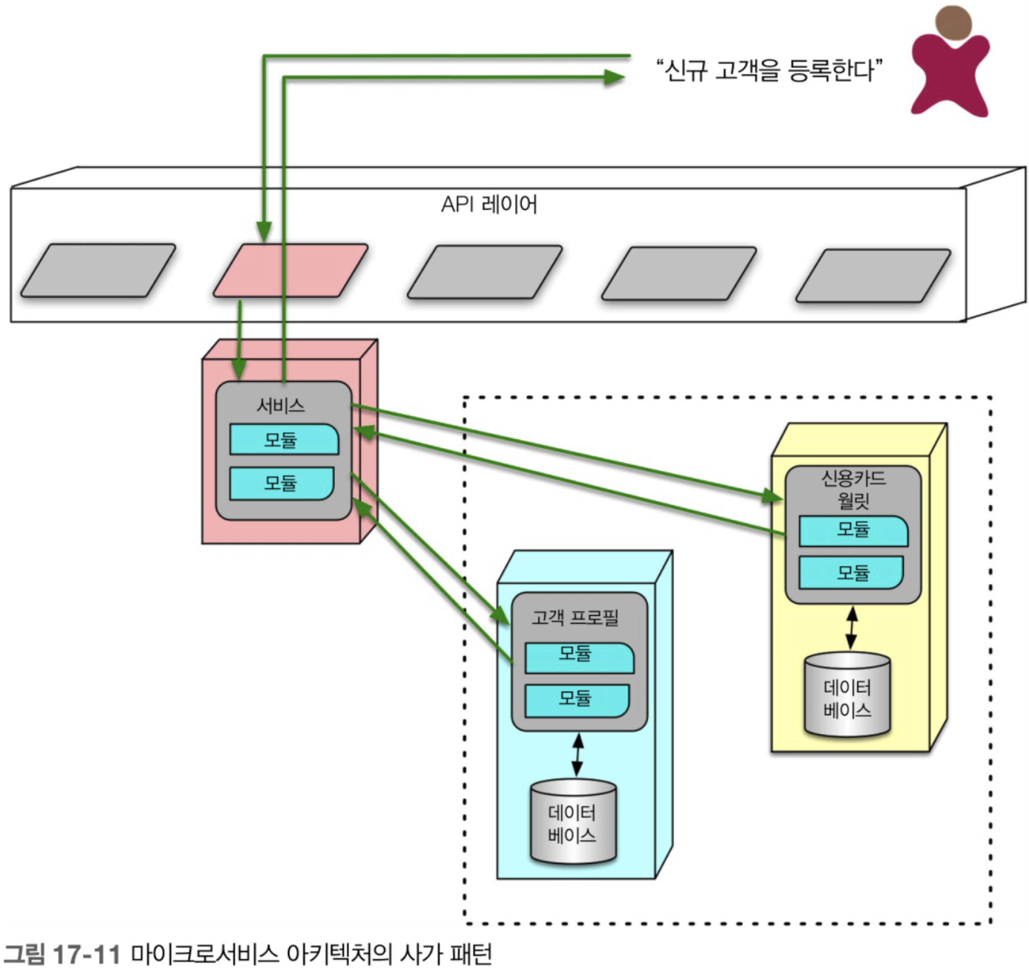 마이크로서비스에서 널리 사용되는 분산 트랜잭션 패턴은 [그림 17-11]의 사가 패턴(saga pattern)입니다.